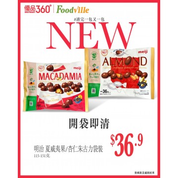 介紹返明治呢隻新貨!明治頂級濃滑朱古力,完美包住整粒脆口夏威夷果/杏仁,一咬—香、濃、脆三重暴擊,不知不覺就自動清晒!尤其新春期間,擺佢喺全盒嚟招呼親朋好友,你就知「開袋即清」唔係傳說~明治 夏威夷果/杏仁朱古力袋裝 115-151 克