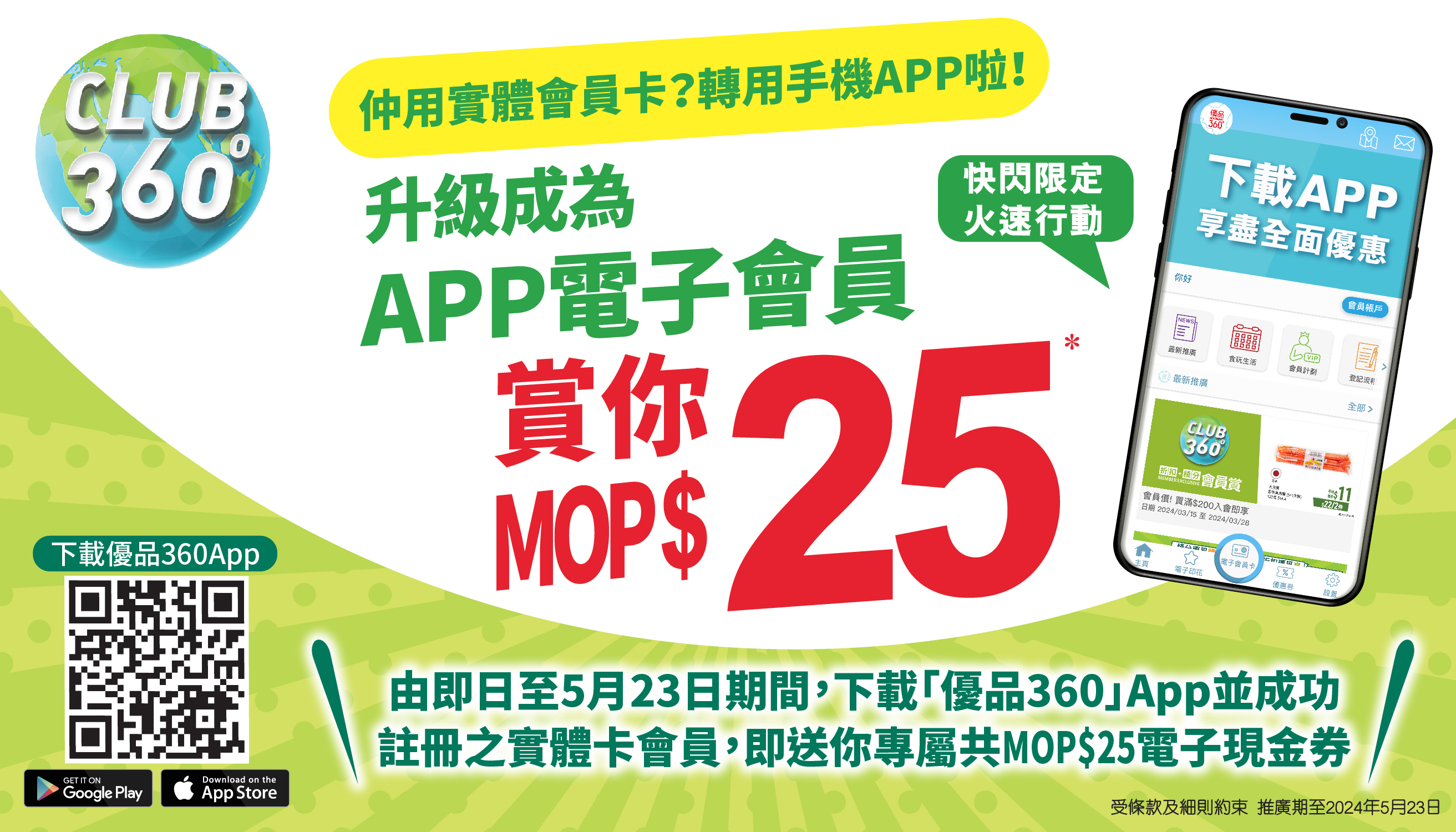條款及細則: 優惠只適用於4月26日至5月23日期間下載「優品360」App並成功註冊之實體卡會員。2張$5電子現金券,及$15額外電子現金券將於成功註冊後自動存入至該會員戶口。電子現金券適用於澳門地區優品360店舖購物滿MOP 150或以上,即可使用一張(單一發票及折實價計算)。有效期由發出日起計連續31天。推廣期: 2024年4月26日至5月23日。貨品如需退款,將從退款中扣除已支付的電子現金券價值。每張電子現金券只限使用一次,每次限用一張,一經使用,即告失效及不會補發。電子現金券不能與其他優惠同時使用。會員須透過「優品360」手機應用程式登入會員帳號及出示電子現金券,恕不接受影印本及截圖。請於付款前出示電子現金券。電子現金券只限指定會員使用,轉發無效。電子現金券不可作轉售、兌換現金,不可與其他優惠同時使用及不設找贖。會員須遵守CLUB 360°會員條款及細則,詳情請瀏覽網頁https://www.bestmart360.com/terms。如有任何爭議,優品360澳門有限公司保留最終解釋權及決定權。